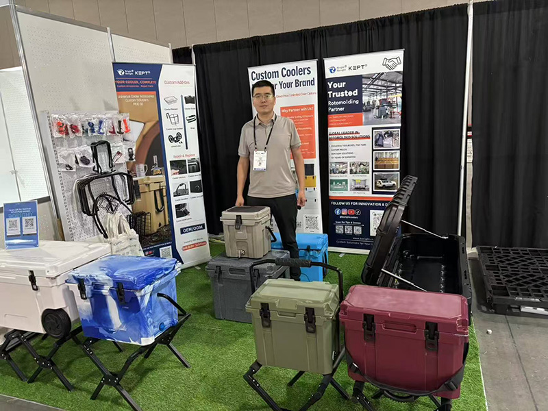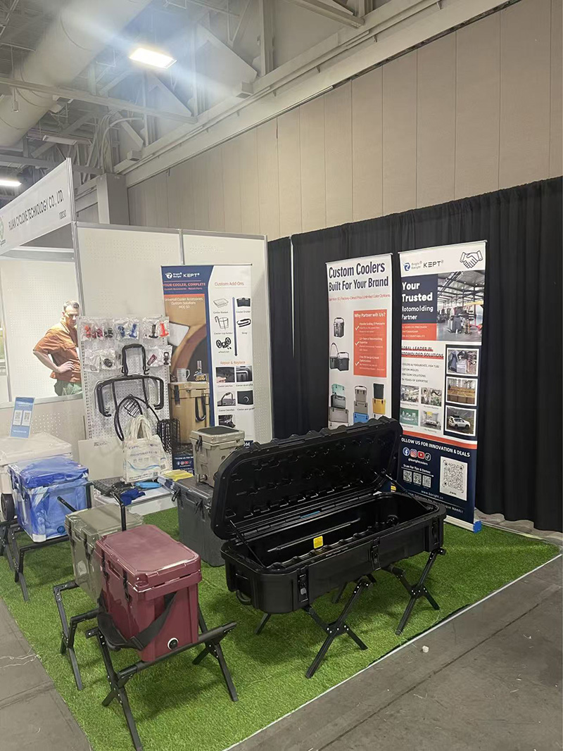 Complementing these are displays of custom rotational molds and cooler accessories, comprehensively covering diverse needs from outdoor storage to recreational activities.